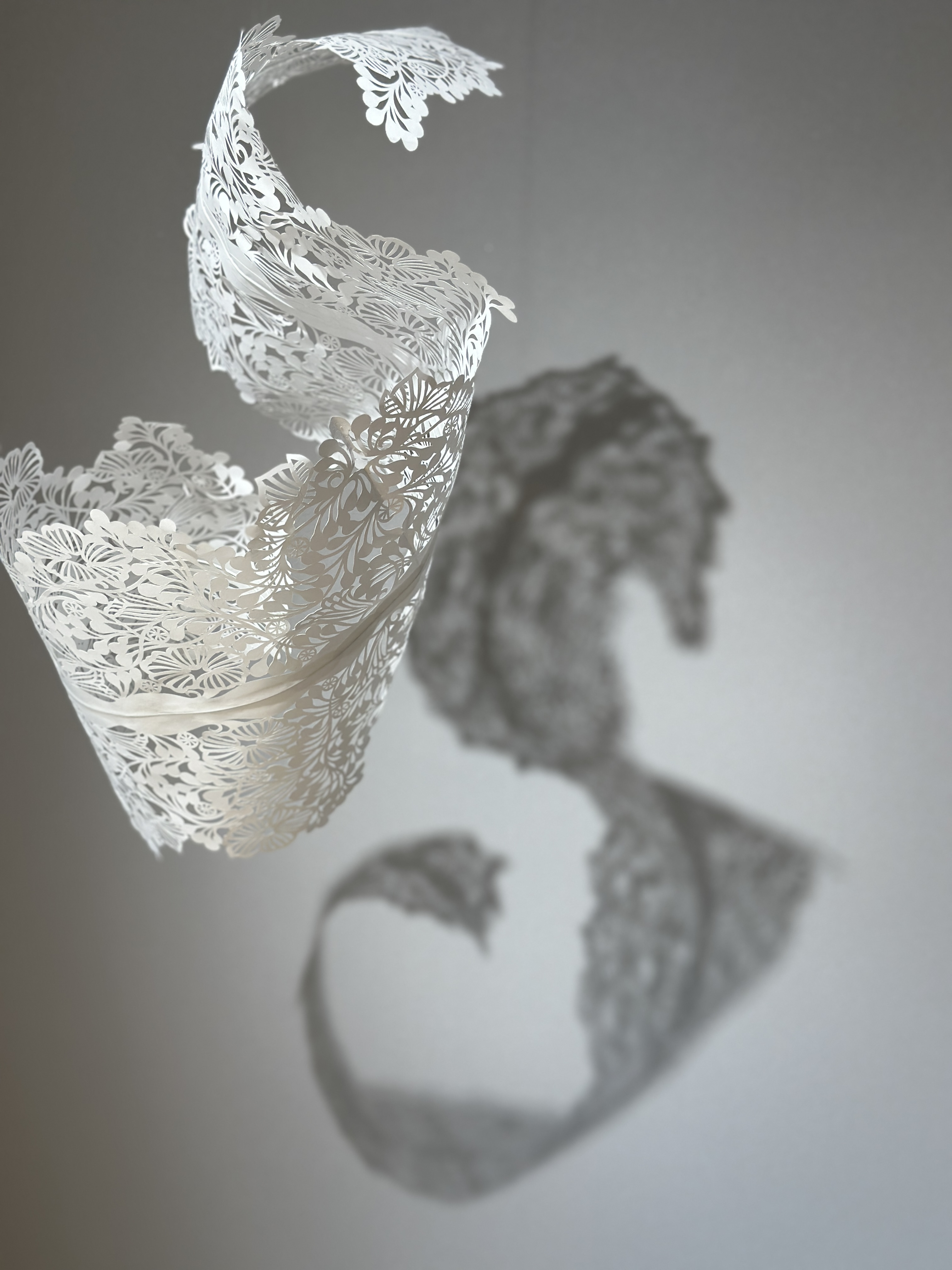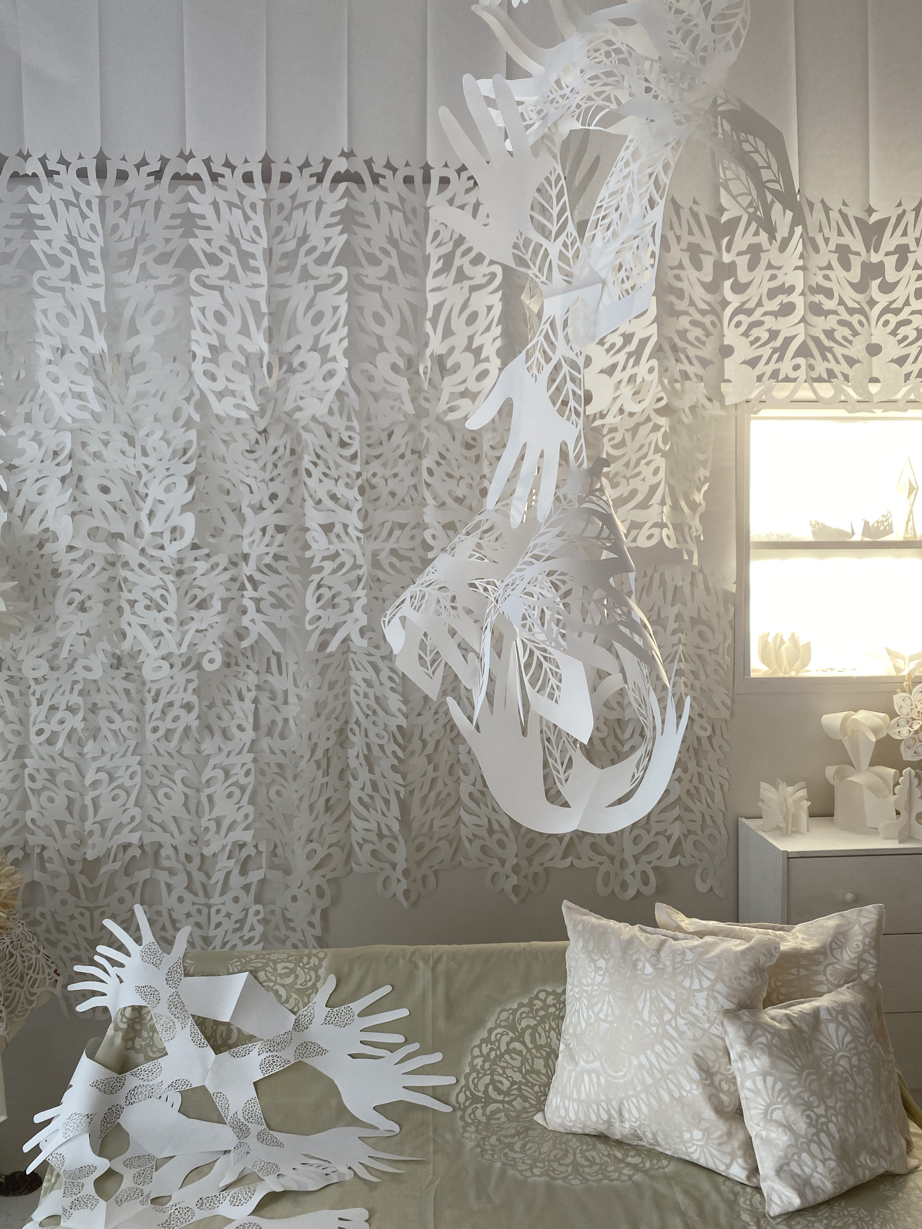 感情や感覚も抽象的な模様で切り開く「切り紙」での制作表現は平面にとどまらず、立体、空間、そして時間も飛び越えて広がっていくことを目指しています
